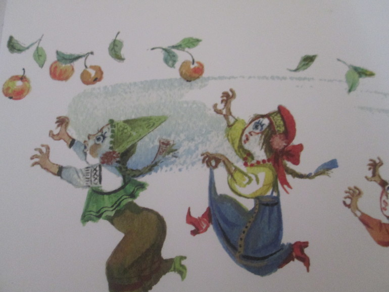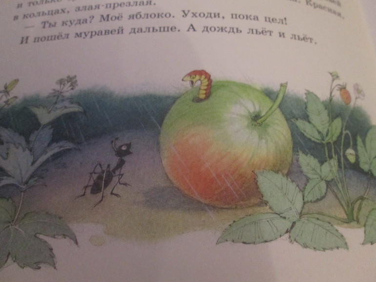 Встречались нам и яблони и "одинокие" яблоки. Вот такое замечательное, хоть и червивое, нашли у Петра Репкина в "Лесных разбойниках" ("Сын-журавль"):