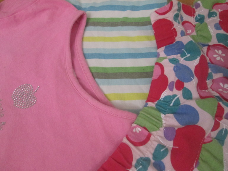 Тут сама дочка спросила: "А что у меня из одежды полосатое есть?" и Мы от книжного шкафа переместились к комоду))) Нашли кучу одежды и ведь с яблоками нашли!)) И до конца дня не снимали "тематическую" юбочку и футболку.