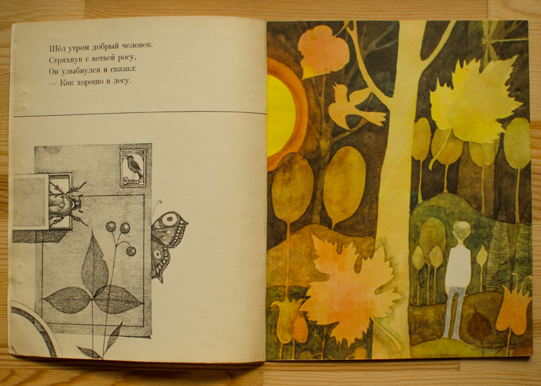 Но переворачиваешь страницу, а там... там лес, солнце, падают листья, поет птичка!