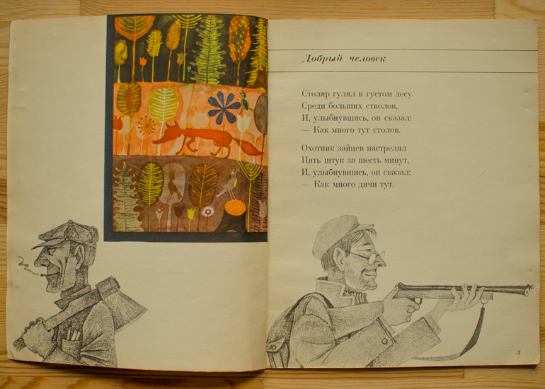 Стихотворение напечатано на двух разворотах. На первом - столяр и охотник, такие характерные лица, по их глазам с прищуром сразу видно, что ничего кроме своих "столов" и "зайцев" они не замечают.