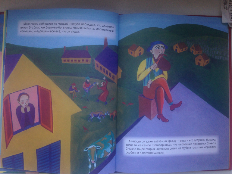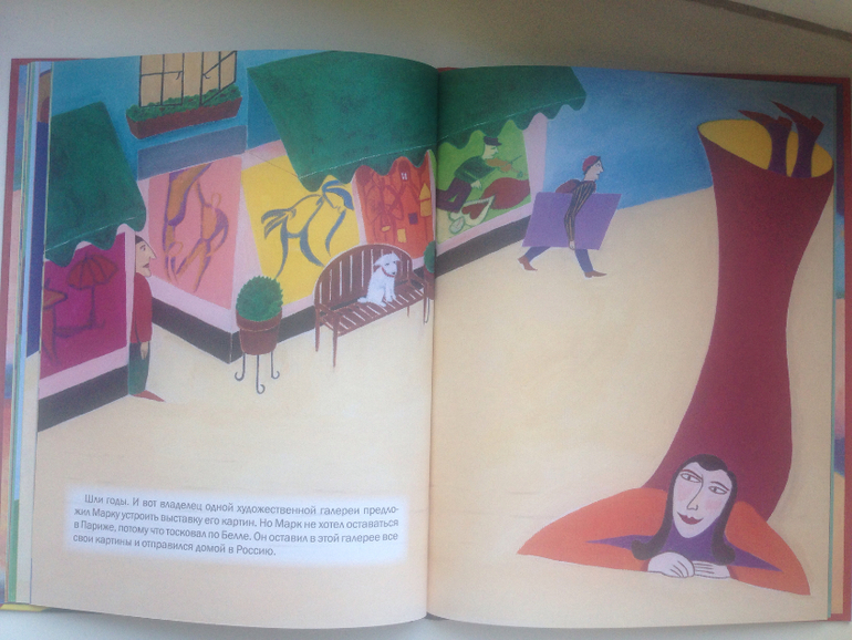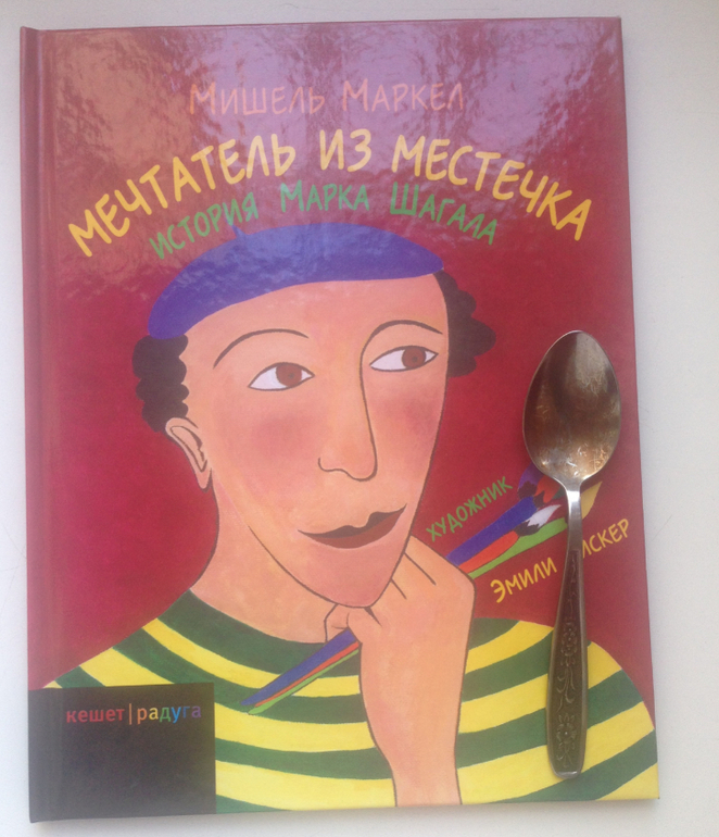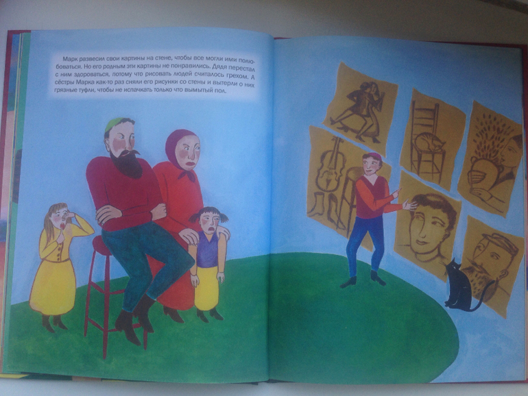 1)Давольно удачная на мой взгляд книжка про Шагала которую с успехом можно читать и 4 года ,и в 10 лет, и даже значительно старше :) тоже интересно.Цена достаточно лояльная. Размер А4 , страниц -36 .Текст , наверное потребует пояснений взрослого( пейсах, ханука, запрет изображения человека)