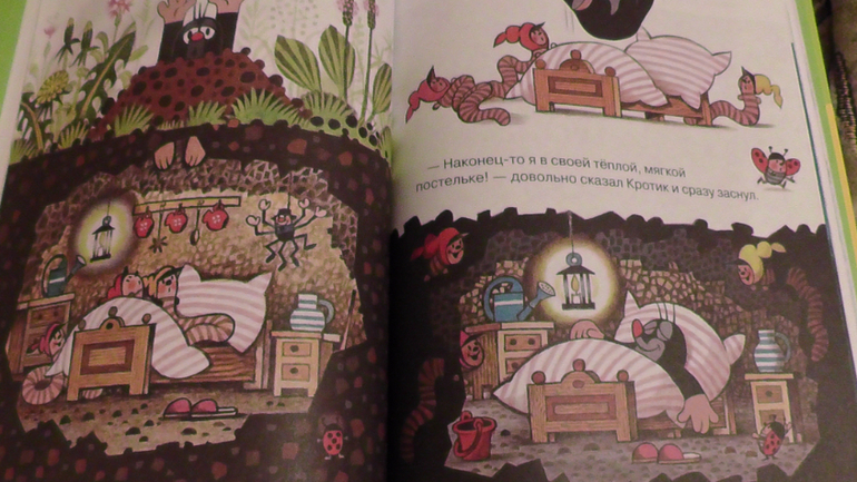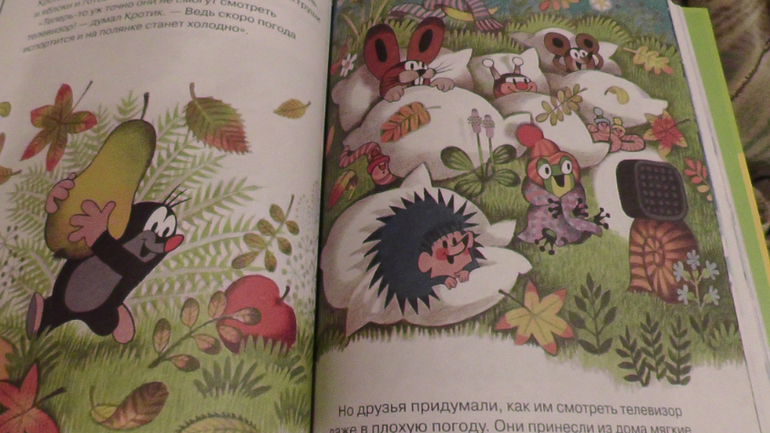 для самых маленькихЭтот милый крот, пришедший из Польши в детстве меня бесил. Что это за мультик, где никто не говорит ничего кроме как "пемебенеме"? Но вот включенный ТВ сделал свое дело, и мой ребенок в 2 года любит " Кротика и автомобиль", "Кротик-садовник" и другие не менее инересные серии. По этому случаю была куплена книга про Кротика, чтобы облечь форму в слова для ребенка. Книга понравилась мне очень.Не говоря уже о содержании, она просто качественная, с большими яркими иллюстрациями и не меловка ( а то уже начинает бесить)).