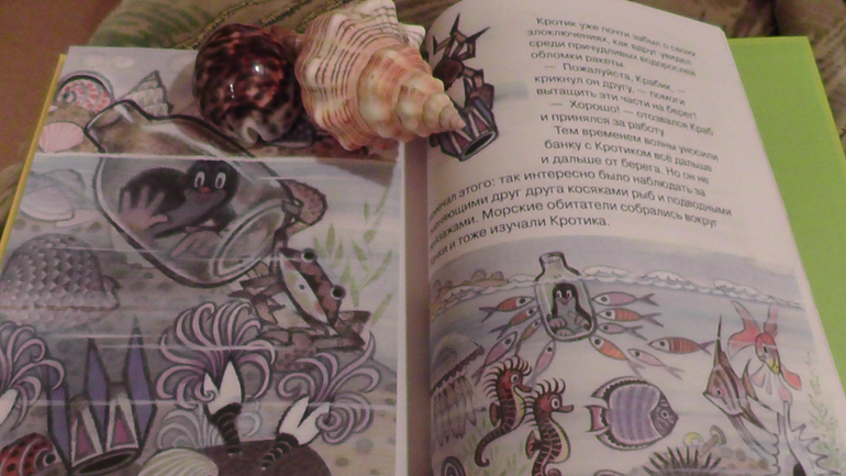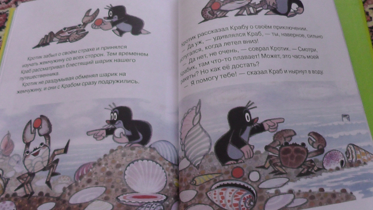 4 Кротик и ракета. Тут любителем космоса можно расслабится и отчалить. Так как Кротик долетел не на Луну, а лишь до берега моря ( или океана). Конечно был в шоке от краба, крокодила. Очень много красивых картинок побережья с ракушками. Одну из них принял Кротик за шляпку, а другую-за телефон. Подружился с крабом, ракету починил и улетел.