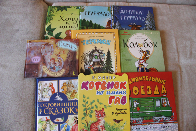 Здесь книги, которые в основном мы читаем на ночь, кроме Теремка и Котенка Гава. "Сокровищницу сказок" тоже пару раз читали днем, пару раз на ночь, хотя сказки там достаточно длинные, я люблю более короткие книжки на сон, в этом плане "поезда" идеальны, 5 минут чтения и спать))))