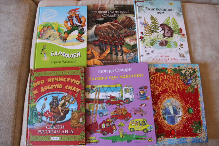 Первая партия - это книги, которые стоят у сына в игрушках, читаем их с младенчества, на многих есть следы активного "чтения". Все из них перечитываем регулярно, сын сам приносит и говорит "ситай". Интересно, что все книги нам подарили))