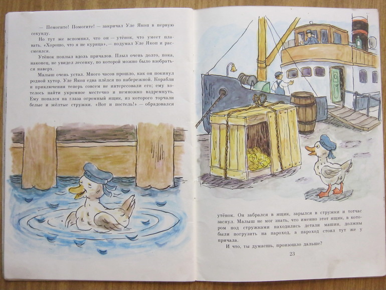 ...в котором его чуть было не отправили на корабле в дальние страны. Но утенок вовремя проснулся, вывалился из ящика и отправился домой, где был встречен соскучившимися друзьями, которых развлекал потом своими песнями про город