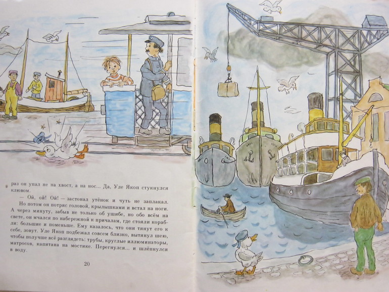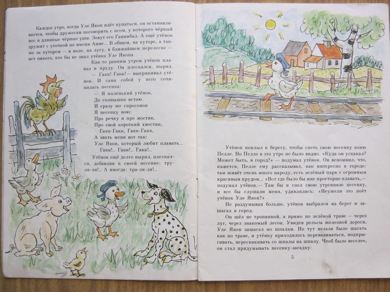 - книга особенная. Не для всех, всем-то она покажется обыкновенной детской книжечкой с незамысловатой историей пешего путешествия деревенского утенка, каковой она и является по факту своего существования. В книге очень простенькие, если не сказать примитивные, иллюстрации автора - Турбьёрна Эгнера, нарисованные будто курица лапой детской рукой. Поэтому мне совершенно непонятно с какого перепугу книгу вдруг страстно залюбила дочь в 3-летнем возрасте. То ли от того, что прочли ее зимой, и дочь вспомнила привольное дачное житье, где она все лето пасла гусей, то ли еще по какой причине, но этой книжкой она затерроризировала всех, даже деда, который говорил с акцентом, и потому с чтением к нему Юлька обращалась в самую последнюю очередь, когда деваться было уже некуда. Мы возили ее то домой, то на дачу, постоянно "забывали", сваливали и перепихивали друг на друга это чтение, а в 4 года я сказала дочке, чтоб читала сама, научилась же. И этот утино-городской кошмар, наконец, закончился.