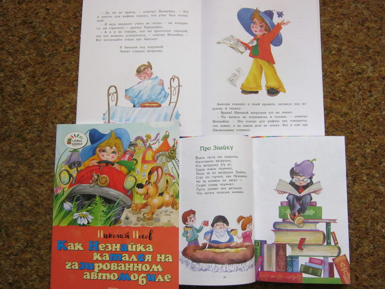 После чтения Подскажи словечко, которая впору пришлась лишь Тёме, он вспомнил Незнайку, но попросил почитать Как Незнайка катался на газированном автомобиле. А мне-то показалось, что ему больше всего понравилось про стихи )) Он тогда долго смеялся, пробовал сам придумывать рифмы. Поэтому про стихи тоже почитали