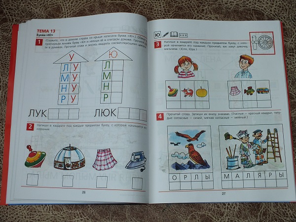 Ближе к середине тетради начинают появляться слоги и короткие слова для чтения, а к концу книги даже несложные предложения.