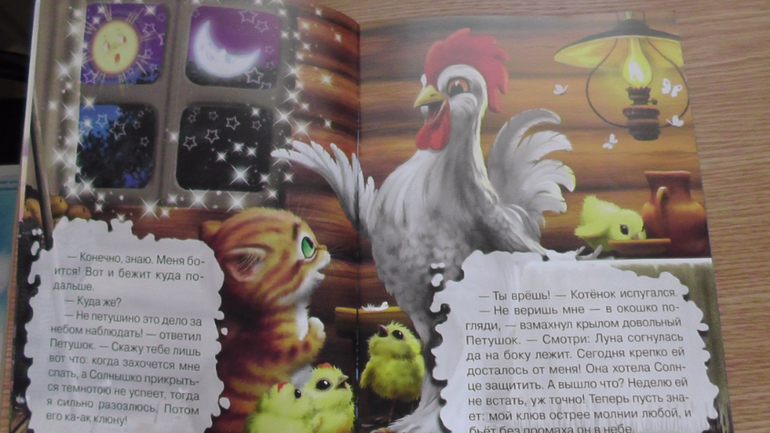 Милая книжечка с безумно добрым котейкой за доступную цену. Иллюстрации крупные, яркие. Претендует на книжечку перед сном, потому что котик озабочен судьбой солнышка. А тут еще сосед-петух подливает масло в котел беспокойства, мол клевал я солнце, вот оно и убежало! И котенок идет солнышко звать обратно. Ищет тропинку на небо. Издание православное, наверное поэтому тут и фигурирует идея этой тропинки.