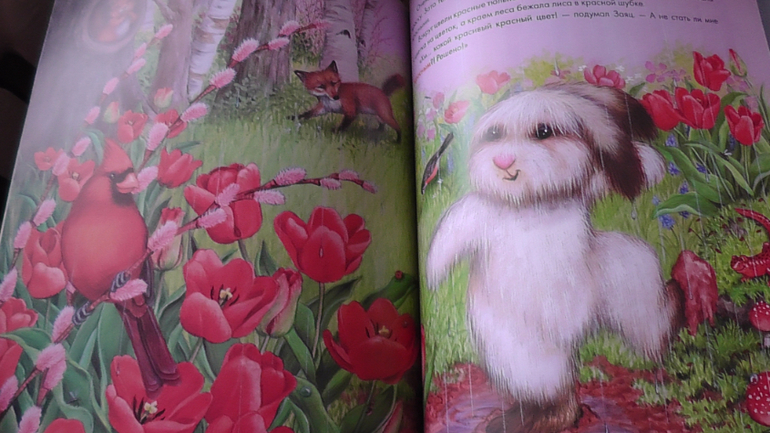 Рассказ видимо написала мама специально для своего кукуси. Что бросается в глаза-маркировка до 3 лет, но при этом включены строчки из стихов поэтов о природе. При этом сами стихи не совсем для трехлеток. Я в принципе не против прекрасного для малышей, но смешение стилей мне режет глаз и слух. Строчки можно конечно пропустить, оставив только « Я пришел к тебе с приветом». Еще упоминается закон Ньютона к слову ( без объяснения закона)). Если о сюжете-то он стал достаточно часто мне встречаться. Заяц решил стать другим и сначала извалялся в меду и цветах-стал желтым. Потом в чернике. Потом лист зеленый надел. Ну и все в таком духе. В итоге вывод-будь таким, каким тебя создали. Если оставить философию этого вопроса, то книжка прекрасно знакомит с предметами и животными одной цветовой группы, иллюстрации просто дышат и брызжат цветом. Все-таки цветотерапия имеет место быть!