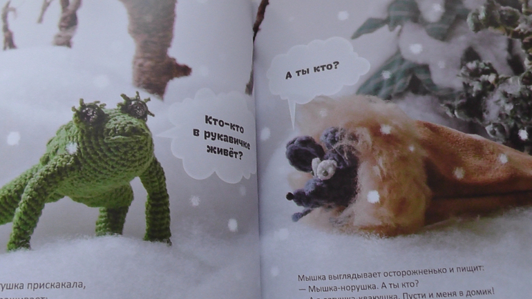 Hand-made. Рукавичка с реальными фото вязанных зверюшек. Создается впечатление мультика и книги одновременно. ООоочень мило! Текст достаточно коротенький, ничего лишнего. Если же мама еще и свяжет что-то похожее, то думаю ребенок вообще проникнется!
