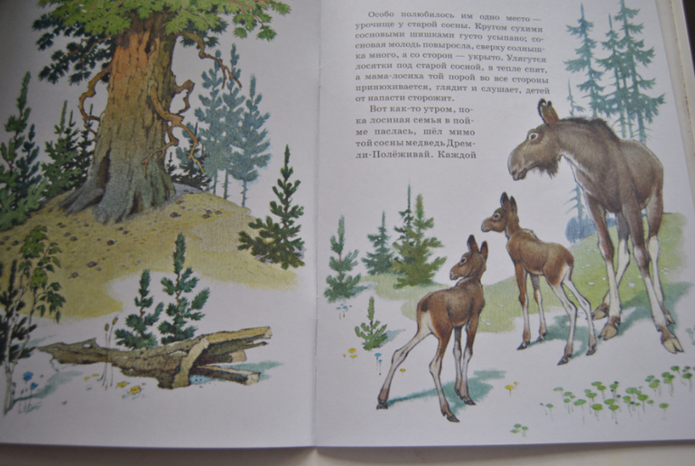 Весной появились у лосихи два лосеночка. Два тонконогих ушастых диких теленочка. Телята маленькие, питались маминым молоком, набирались сил. Когда они подросли, мать-лосиха стала выводить их на солнышко греться, к старой сосне.