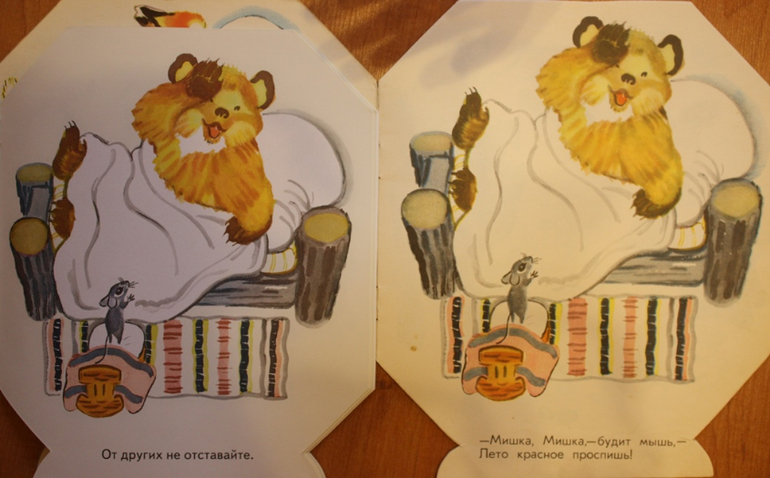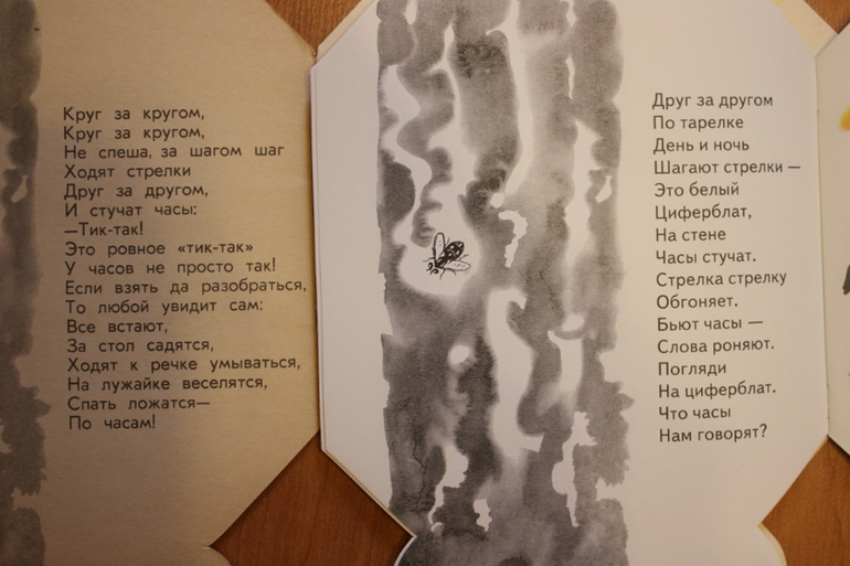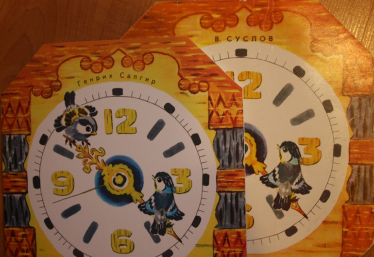 Огорчением для меня была покупка книги Часы, брала на замену своей старой горячо любимой детской книги. Иллюстрации одинаковые, а вот авторы и соответственно стихи разные. На выставке текст не посмотрела, видимо голова пошла кругом от количества хотелок. Мне ближе и роднее стихи Вольта Суслова, знакомые с детства. Формат книги немного уменьшился по сравнению со старой. Белая бумага на фото - новая книга.