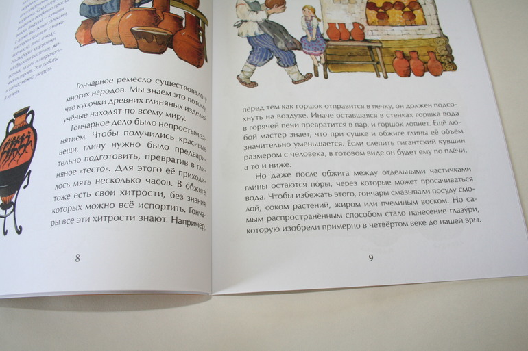 младшим школьникамКнига читается на одном дыхании. Написана живым, интересным языком. Маленьким читателям предстоит отправиться в путешествие по своему дому и найти глиняные предметы. Если у Вас в доме нет глиняных изделий, не беда. Прочитав эту , Вы узнаете как изготавливали глиняные горшки в разные времена, что в них хранили, как научились обжигать глиняные изделия, чтобы они стали прочными, зачем горшки покрывали глазурью. Рисунки Наталии Кондратовой помогают лучше понять текст книги и познакомят юных читателей с разновидностями глиняных изделий - крынкой, кувшином, гусятницей. На 11 странице Вы найдете рисунок сосуда с подписанными элементами - венчиком, туловом, плечом, шейкой и ручкой. Юным читателям предстоит познакомиться с возникновением фарфора в Европе и в России, узнать интересные факты про использование глиняных табличек в древние времена, познакомиться с другими строительными материалами, в составе которых есть глина.
