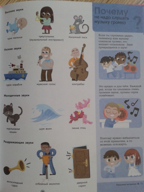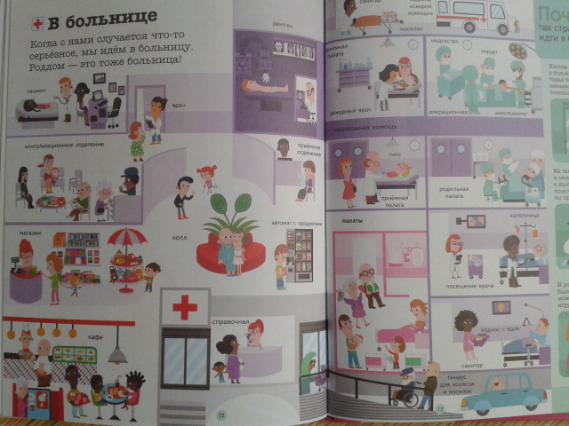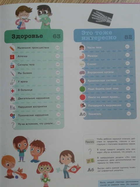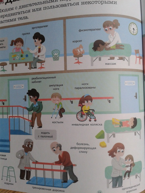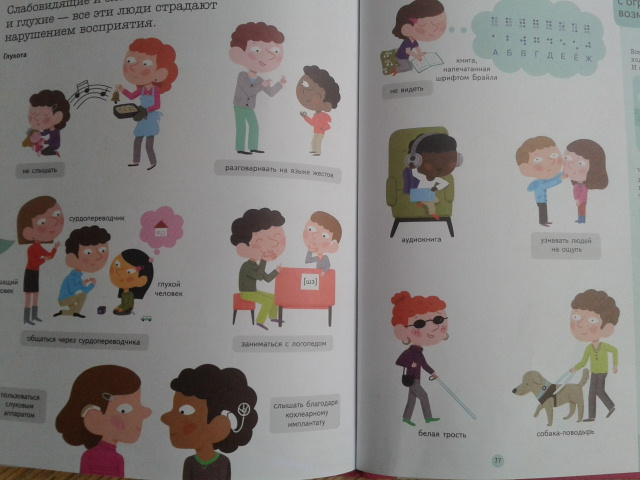 Несколько разделов посвящено людям с особенностями тела и психики. К тому же во всей книжке встречаются в обычных ситуациях такие люди. Это тоже нужная тема, которая почти не в одной энциклопедии не встречается. Ведь столкнувшись с ребенком на коляске ваш малыш не станет тыкать в него пальцем и спрашивать на всю улицу: "Почему он не ходит?".