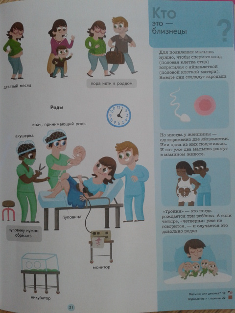 Очень хорошо подан материал. Без пошлости и лишних подробностей. Справа на развороте даны дополнительные сведения по теме. Тут например возможность появления на свет сразу 2-4 малышей.