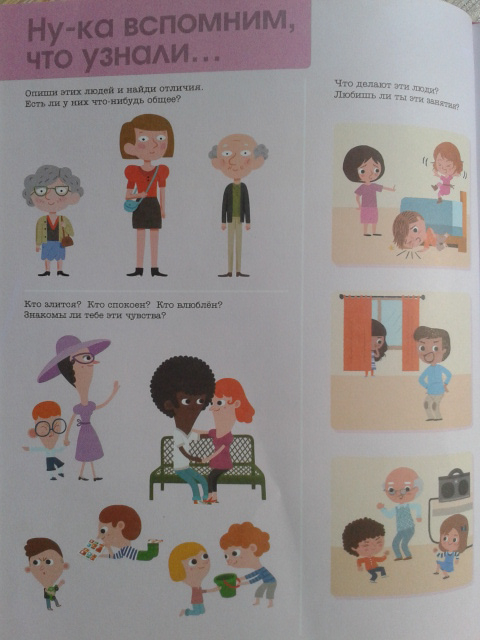 Есть развороты с возможностью обсудить происходящие сцены из жизни людей и пополнить свой словарный запас.
