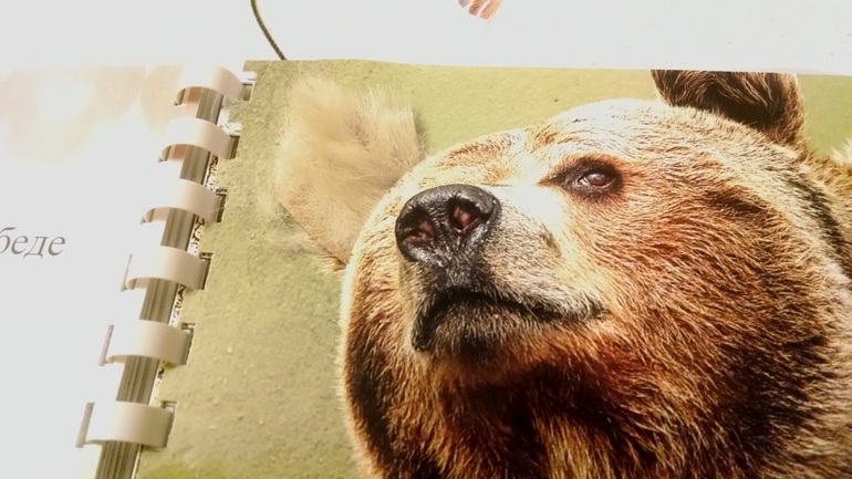 Делаем 2 надреза для уха медведя - по краю и у основания. Продеваем полоску шерсти (натур. или иск.) и закрепляем скотчем с обратной стороны фотографии. Если шерсти нет, можно и так оставить.