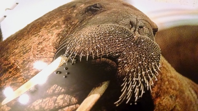 Делаем колючие усы моржу. С обратной стороны фотографии в районе усов острой ручкой протыкаем отверстия. С лицевой стороны у нас получается шершавый "пупырчатый" рельеф.