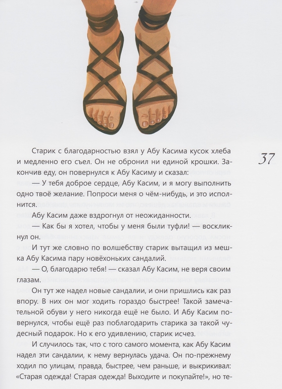 Волшебные сандалии Абу Касима. Абу Касим торговал старой одеждой, но никто не хотел покупать у него лохмотья. Однажды на дороге он встретил старика и отдал ему свой хлеб. Старик сказал попросить его о чем-нибудь. И Абу Касим попросил туфли. С этого дня к нему вернулась удача и никогда не покидала его.