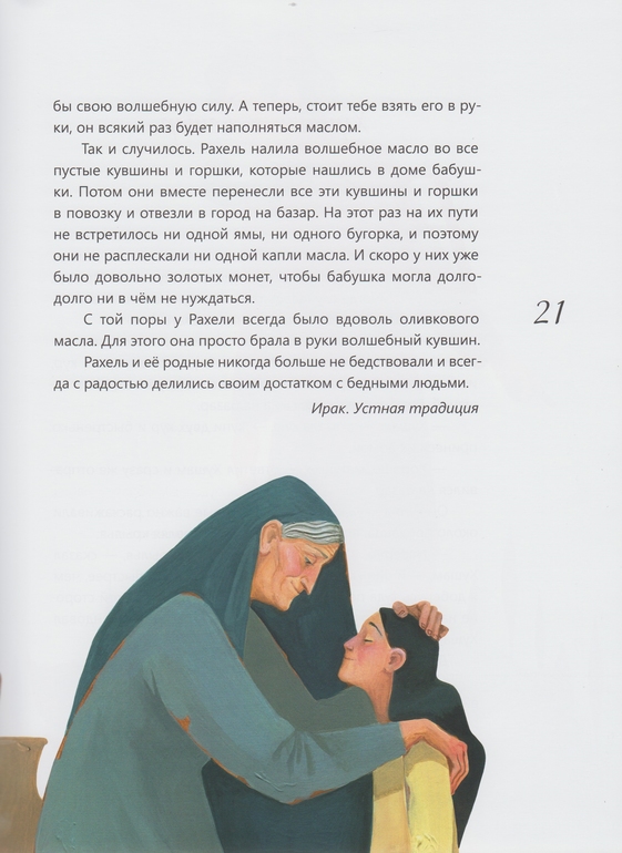 Волшебный кувшин. Однажды дочка гончара сделала такой кувшин, в котором само собой появлялось оливковое масло. Девочка тут же решила отвезти этот кувшин бабушке, живущей очень бедно. Гончар запряг в повозку ослика, поставил туда кувшин масла и ещё 4 кувшина. Девочка ехала очень медленно, но масло всё равно расплескивалось на кочках. В поездке чёрт подговаривает девочку отдать ему кувшин, и тогда масло перестанет плескаться. Но девочка нипочем не собиралась отдавать кувшин, который везла бабушке. И довезла.