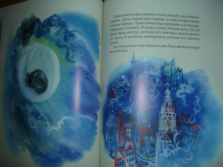 Вот, например, из тени выглядывает "Лунный свет". Я увидела в чьём-то отзыве эти глубокие синие акварели и упала. Всё, хочу. Мне казалось, что книга больше для девочек. Ну, или натур мечтательных. Пока что мой сын под такие характеристики не подпадает. Твёрдо стоит на ногах и не допускает никаких сантиментов. Представить, чтобы он наглаживал в умилении и нежности картинку, мне сложно. Зато я сижу, ощупываю выпуклости на обложке и не могу остановиться. Сижу и думаю: даже самым трезвым натурам иногда неплохо оторваться от земли и помечтать.