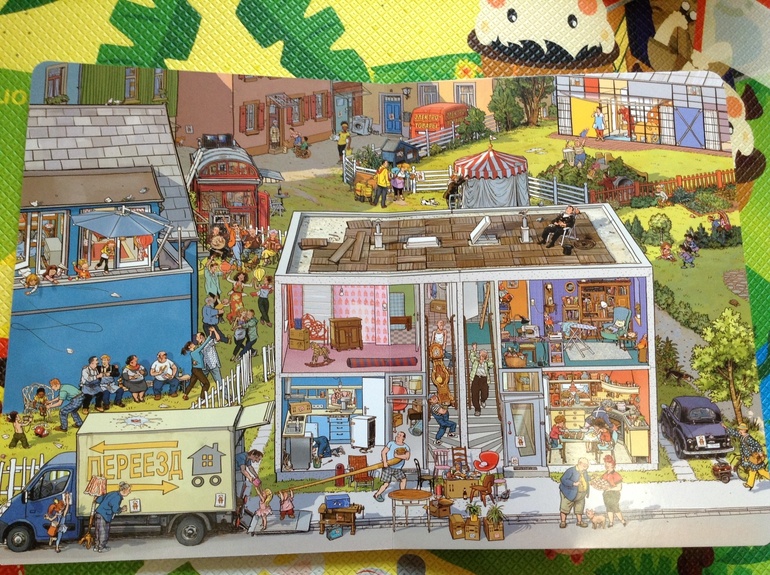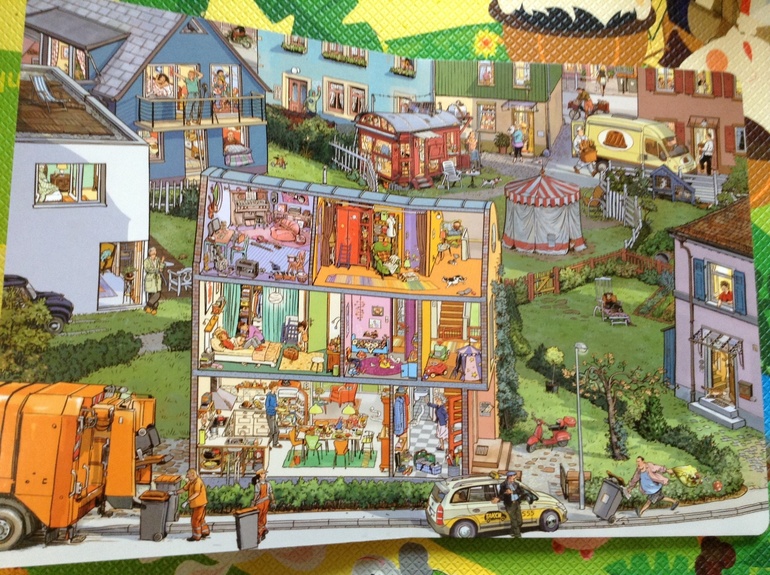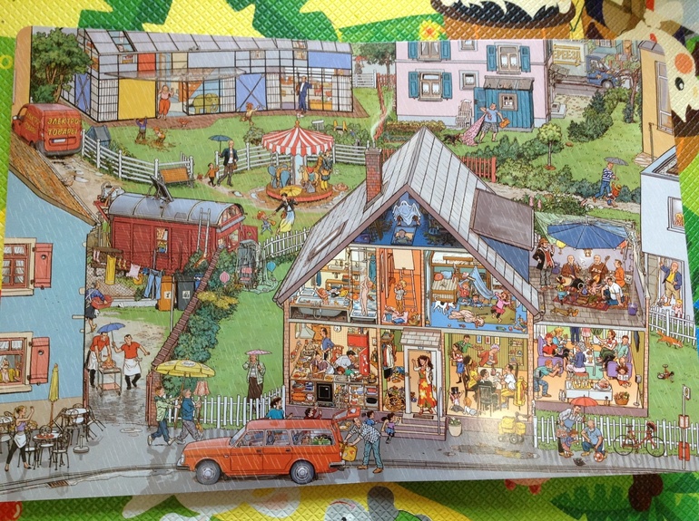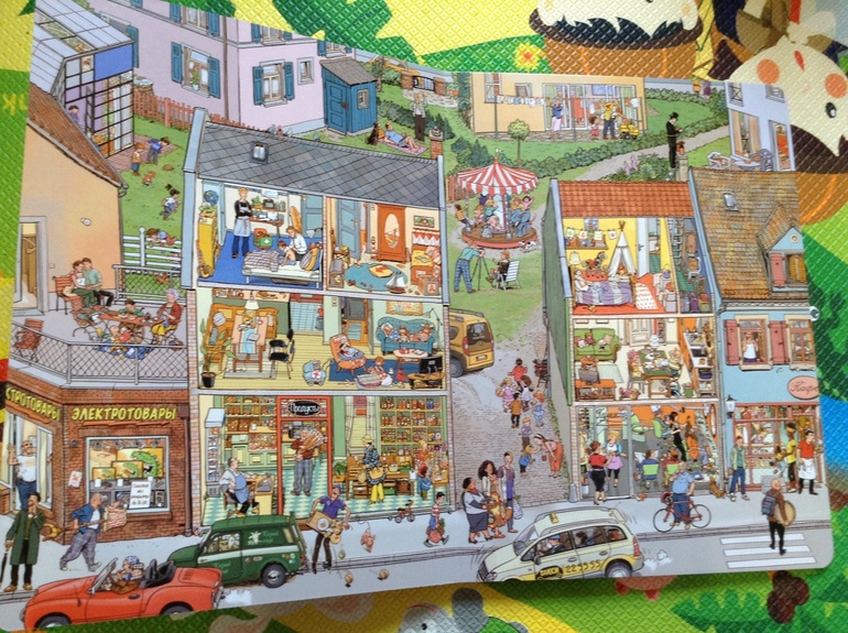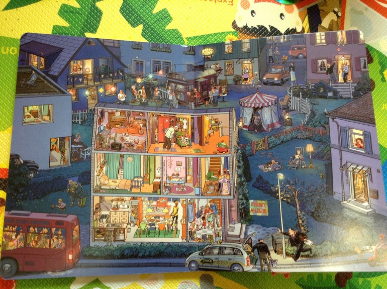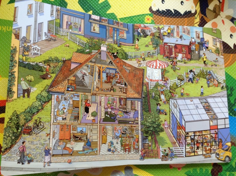 Сюжет на этот раз посвящен событиям не в деревне или в городе, а в домах. У нас есть возможность понаблюдать за соседями одного городка в течение дня. Семь разворотов и шесть домов "в разрезе" с утра и до позднего вечера (на каждом развороте - следующий соседний дом, на первом и последнем - один и тот же, только утром и вечером).