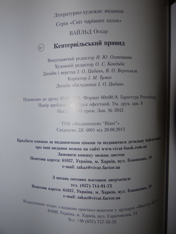 Вайльд О. Кентервільський привид / [літ. переказ Ольги Пилипенко, ілюстрації Євгенії Чистотіної]. - Х.: Віват, 2015. - 64 с.: іл. - (Світ чарівних казок).