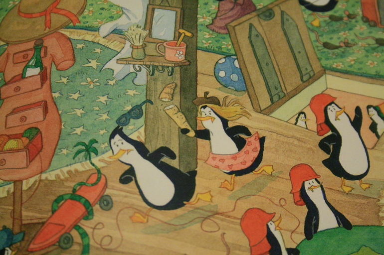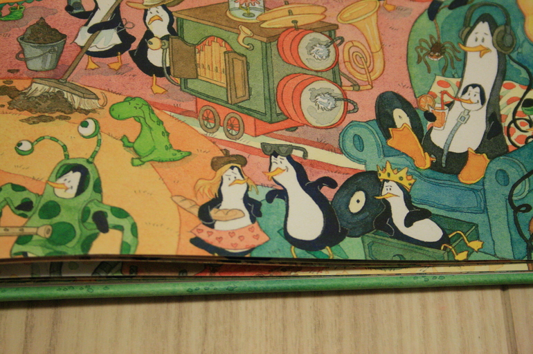 Потом бы интересный разговор с милой девушкой из Поляндрии, которая продала мне "Польди и Павлушу" за 400р, т.к. книга была последняя и с прилавка. Такой цене я была очень рада. Девушка рассказала мне много интересного о само книге и авторах. Что нарисовали ее два брата близнеца, которые рисют в одной манере, что не отличить, где один, а где другой водит кистю. Иногда начтаь персонажа может первый брат, а второй закочит за него. И еще в книге много юмора, который не всегда понятен детям, да и не всем взрослым. Вот тут, например, изображены пингвины, переодетые в группу "ABBA":