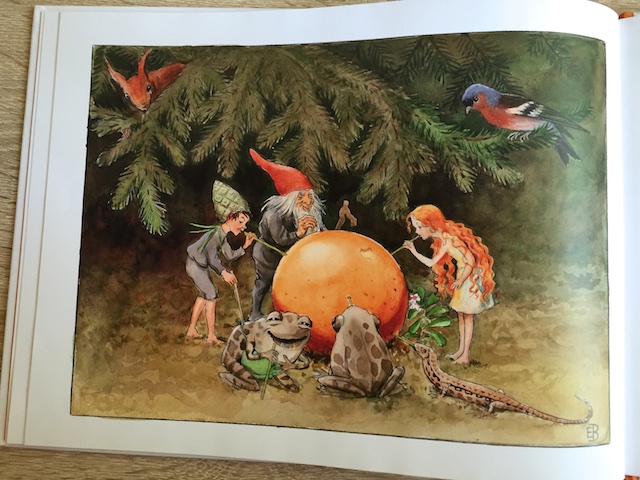 А попросить она может. Выяснилось, что моя малышка не только сюжеты с первого прочтения запоминает, но и вообще долго помнит книги, которые мы читали. Даже если было это только один раз. В апреле в каком-то контексте зашла речь о феях и Настя спросила, что это. Я полезла в коробку с книгами на вырост, чтобы показать наглядно, и первой мне попалась "Солнечное яйцо" Эльзы Бесков. Посмотрели на фею, прочитали один раз и убрали обратно в коробку. И вот, почти 5 месяцев спустя, Настя просит: "почитай про Мальчишку-Шишку. И про ворону". Я сама не сразу вспомнила, о какой книге идет речь! Достала, читали бесконечное количество раз, Настя теперь время от времени оказывается то проказником Мальчишкой-Шишкой, то танцующей лесной феей. Иногда сама берет книжку и начинает по ней рассказывать сказку, довольно близко к оригиналу. История и особенно иллюстрации восхитительные. На каждом развороте одна цветная иллюстрация и одна черно-белая зарисовка.