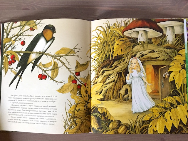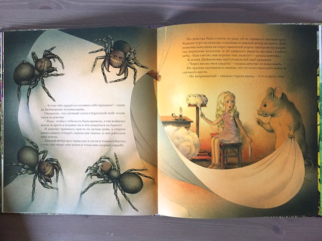 В пару к "Солнечному яйцу" Настя каждый раз просила читать "Дюймовочку". Кажется, в июньском дневнике я про нее рассказывала. С тех пор книжка лежала в шкафу, доча сама про нее вспомнила. Выбирала именно этот вариант с иллюстрациями Ибатуллина, хотя у нас эта сказка есть еще и в сборнике с итальянскими иллюстраторами. А я думала книжку пристраивать, но теперь, конечно, оставила. Прочитана бесконечное количество раз и также постоянно присутствует в играх.