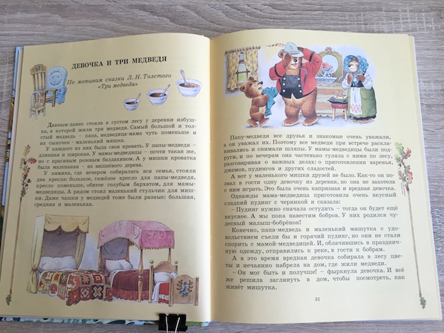 Из сборника "Лучшие сказки со всего мира" бесконечно читали "Спящую красавицу" (я ее уже наизусть знаю), "Белоснежку". Из нового - вариации на тему "Три медведя" (где медведи пудинг едят) и "Волк и семеро козлят". Более мягкие версии, чем в привычных нам пересказах, европеизированные такие.