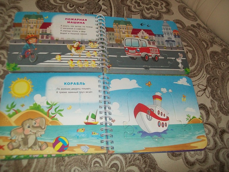 На волне любви сына к паровозам купила книжку как ваша. Мне ни стихи ни рисунки не нравятся, сын книжечку любит. Вытаскивает все пазлы и соединяет их между собой - получается Паровозик с вагончиками. К сожалению, возюкание этого паровозика с вагончиками повредило выступающие кончики пазлов :(