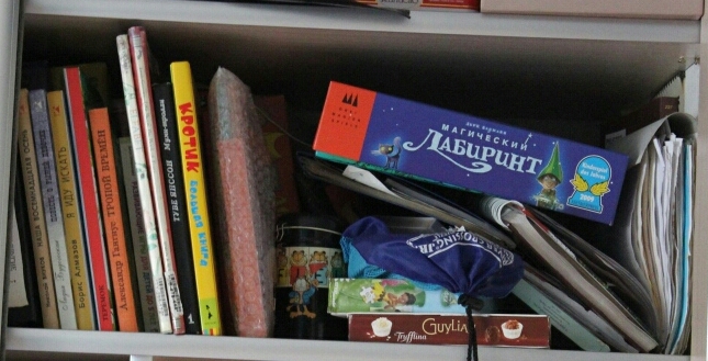 Третья полка долго служила пристанищем для настольных игр. В ряд стояли коробочки, очень красиво было. Но непомерно разростающаяся библиотека вытеснила всех иждивенцев в шкаф, за глухие створки и я расставила наверху самые красивые, самые ценные книги: по-настоящему сокровищ у меня нет, самая дорогая книга стоила что-то около тысячи. Но сами видите, сейчас там Оливия соседствует с "когда я стану королем" и драконом- и вроде никто не ссорится, всем место нашлось.
