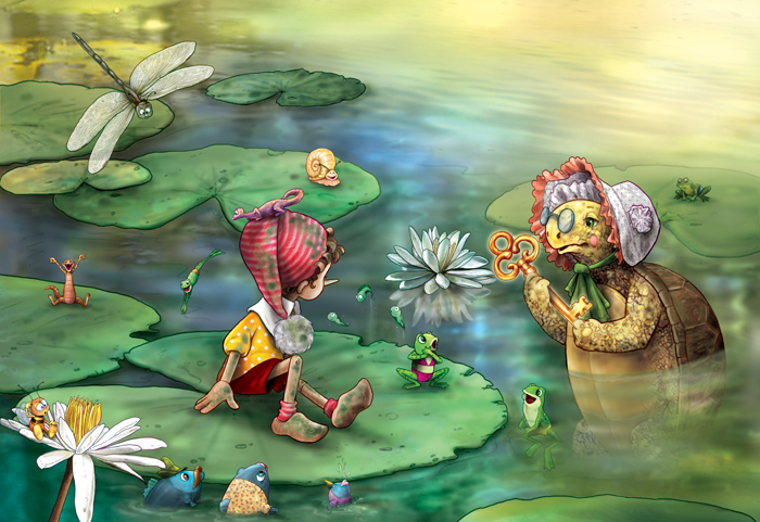а мне только сам мальчик Буратино понравился, даже очень. Понравились отдельные детали - на последней иллюстрации, например, пчёлка, лилия, рыбки - о-о-чень симпатичные. А в целом - ощущение коллажа, как будто все сверху приклеено и очень плоское. Извините. Просто раз уж зашел разговор.