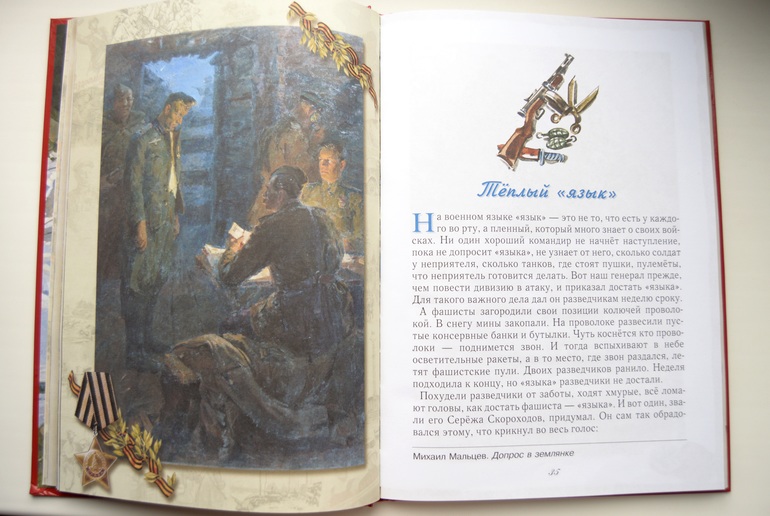 В книгу вошли рассказы о Великой Отечественной войне. Рассказы проникновенные, показывающие тяготы с которыми пришлось столкнуться защитникам нашей Родины. В книге большое число иллюстраций, встречаются репродукции известных картин. Книга нужная, память о страшной войне должны хранить наши дети. Рассказы Митяевы написаны легким, живым языком и очень реалистично представляют картину военного времени. Еще отмечу крупный шрифт книги, значит Илья, в скором времени, сможет прочесть ее самостоятельно.
