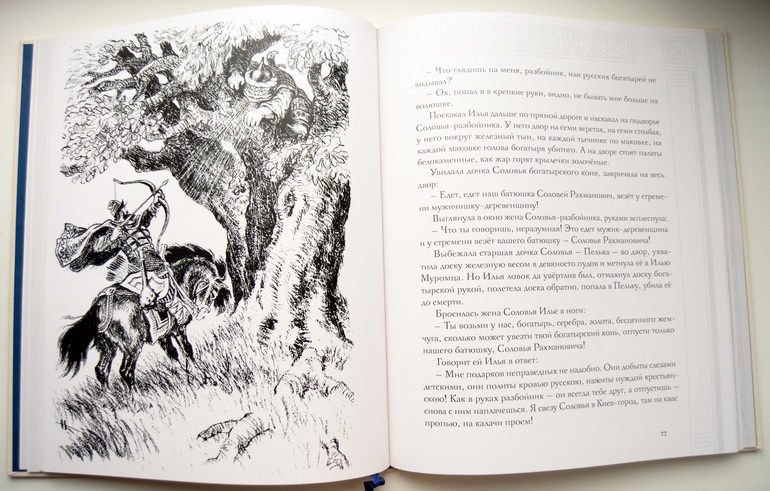 Это вступление к необыкновенной книге - Русь богатырская. Былины с иллюстрациями Н. Кочергина. Здесь его иллюстрации вписываются идеально. Большинство иллюстраций черно-белые, в конце книги есть глава В мастерской Н. М. Кочергина, где выборочно представлены иллюстрации. Книга форматом А4, 176 стр. Былинный текст требует дополнительных пояснений при чтении, но какие там слова, песнь….