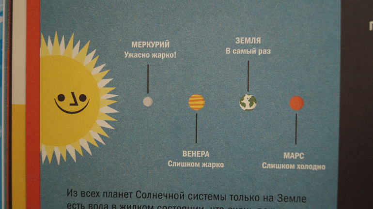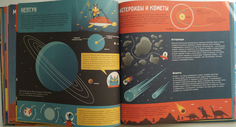 Хотя некоторые сведения не укладываются у меня в голове не смотря на все старания авторов. Чего только стоит первый разворот о Вселенной! 13,7 миллиардов лет назад случился Большой взрыв, 200 миллионов лет после Большого взрыва появились первые звезды, 500 лет после Большого взрыва появились первые галактики. Вот эта информация чуть не сотворила большой взрыв моего мозга! А как на счет того, чтобы представить себе температуру в 20 миллионов градусов Цельсия? А??? И таких удивительных данных в книге много.
