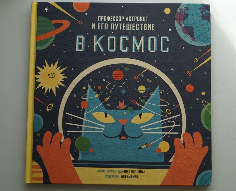 Книга "Профессор Астрокот и его путешествие в Космос" очень интересно сделана. Она большая, квадратная, яркая. С необычными плакатными иллюстрациями. Чудесная шероховатая бумага на обложке усыпана серебристыми, искрящимися звездочками. И еще меня покорила толщина обложки. Примерно 3,5 мм. Она не пухлая и именно толстенькая. Такая вся приятно-тактильная.