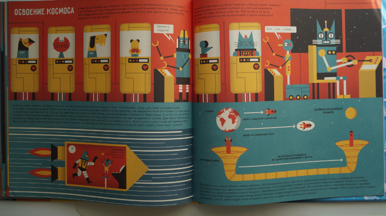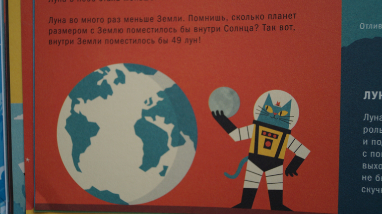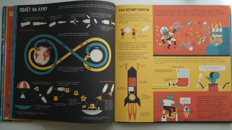 * Космические путешествия. Полет на Луну. Вот здесь чувство гордости россиянина будет заметно ущемлено. Сразу чувствуется, что книгу писал американец. Очень кратко о Юрии Гагарине и собаке Лайке. В тоже время полет на луну расписан во всех подробностях. Но мы то знаем, какой огромный вклад в развитие космонавтики и изучение космоса внесли русские ученные и космонавты. И обязательно расскажем об этом детям.