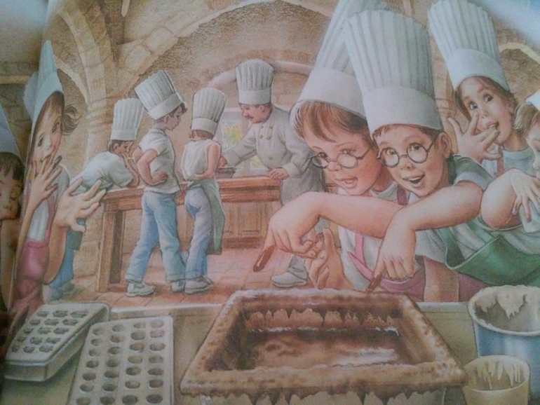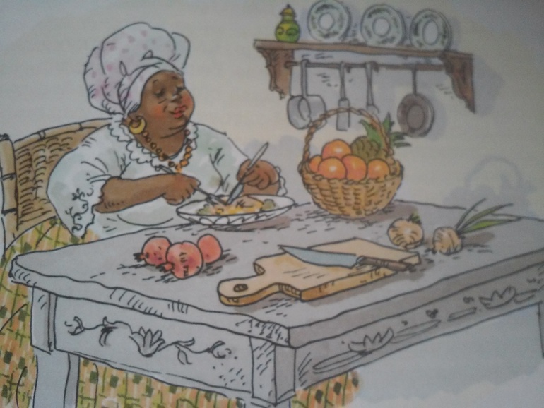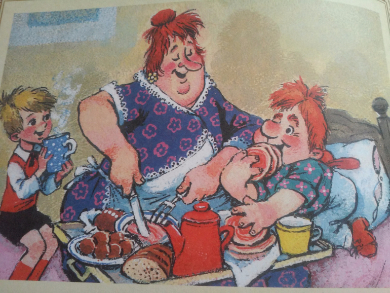 Мама всем известного сорванца Эмиля, помешивает соус для жаркого, не обращайте внимание на окно, это всего лишь папа с сидящим крепко во рту снежком, мы же про еду, хотя ... Рисовал Бьёрн Берг.