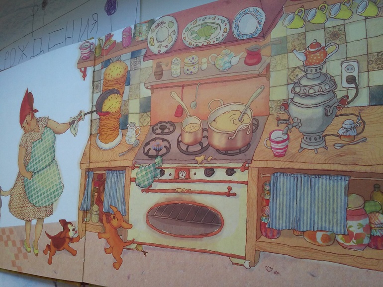 Петя, у меня не поместился, видимо блинов много съел, а процесс и результат завораживающий. ММММ самовар с блинчиками! Лика как ты заказывала! Художник Елена Селиванова.