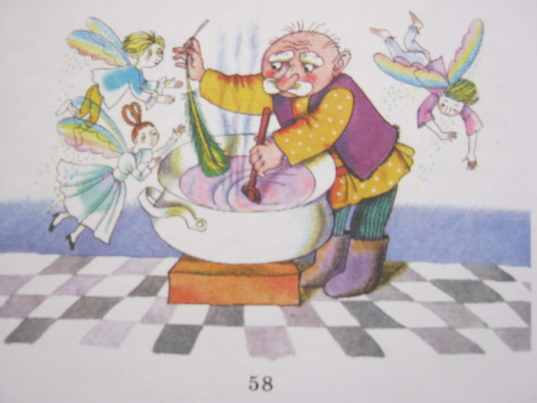 "Потом волшебник взял Лёлину игрушечную посуду и стал варить в кастрюльке новую Лёлину варежку, папины коричневые шнурки и зелёное попугайское перо. Ещё он хотел ободрать лиловые лепестки с волшебного цветка, но фея не разрешила. Где же, позвольте спросить, будут жить человечки? Нет уж, коли колдуете, чтобы лечить, то, пожалуйста, без ущерба для окружающих! Честно говоря, Леле тоже было немножко жалко новую розовую варежку со снежинками. Теперь её, Лёлины, пальчики останутся бездомными! Но раз мишка болеет, надо сначала его спасти! Поэтому Лёля ничего не сказала дедушке-волшебнику. Чтобы лекарство получилось, пришлось положить в кастрюльку ещё красную пуговицу от маминого халата. Думали положить и чертёжную линейку, но она не влезла в кастрюльку - слишком уж длинная. Прилетали эльфы и стряхивали в лекарство пыльцу со своих крылышек" - Т.Рик "Лекарство для медвежонка"