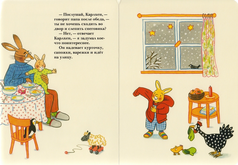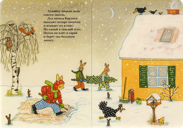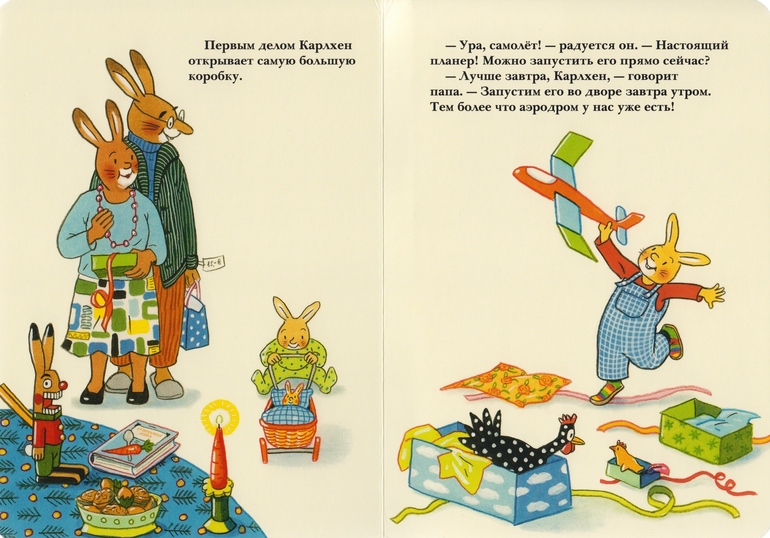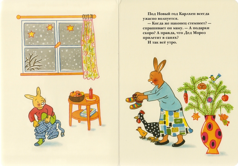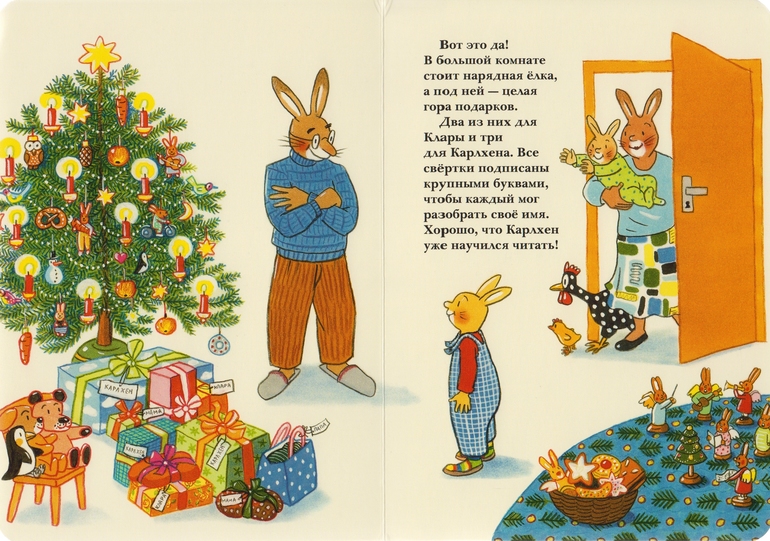 Книжечка краткая: Карлхен ждал, готовил аэродром для саней Санты (Деда Мороза) и получил подарки как стемнело, а на часах пробило 5.00 (думаю, pm).