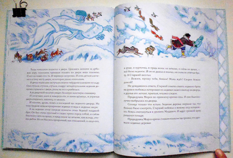 Иллюстрации по-зимнему "морозные", с яркими акцентами в любимой манере Николая Кочергина - с большим вниманием к малейшим деталям, в том числе к утвари и атрибутам одежды.