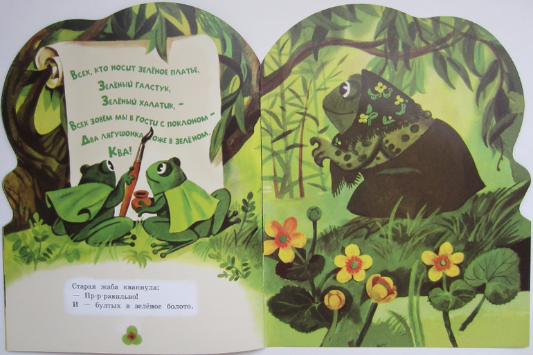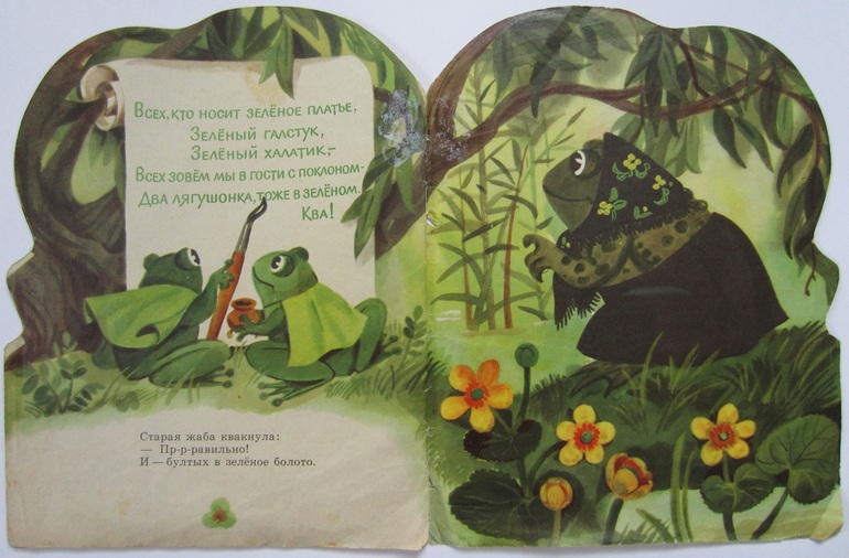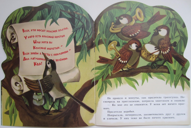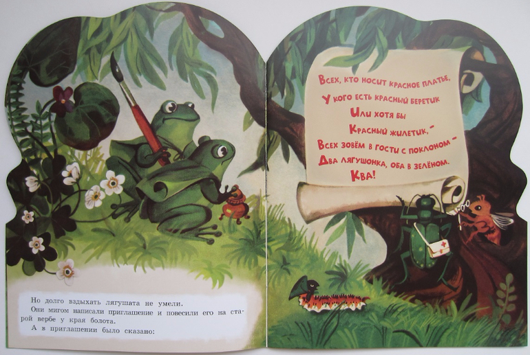 Сама история такая милая, такая поучительная) Два лягушонка, Квакушка и Зелёная Лапка, решили выделиться! Надоело им сливаться со всем зелёным. И позвали они в гости всех, у кого хоть что-то красное есть. Собрались к ним гости, стало ярко, весело на полянке. Одна старая жаба была недовольна этой затеей. Лягушатам мало было любоваться на гостей, они ещё взяли на время шляпы у мухоморов - повеселиться решили. А аист тут как тут: лягушата теперь как на ладони! Пришлось лягушатам срочно бросать шляпы и прятаться! И урок они потом из этой истории извлекли: совсем других гостей позвали)