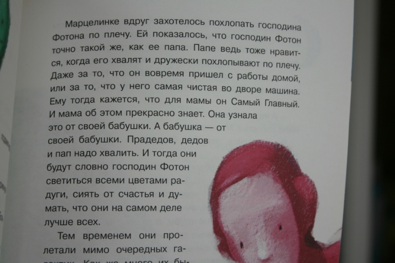 Вспомнилось, что после покупки "Марцелинки" я всунула ее нашему папе со словами: "Вот, читай и учись, как с детьми разговаривать надо!". Это был первый шаг к обучению папы разговаривать с ребенком как с ребенком. Я, конечно, понимаю, дети - тоже люди, но люди маааленькие, ласковые и ранимые, и разговаривать с ними надо по-особенному... Так что книга - еще и учебник для начинающих пап :))) Мамы как-то инстинктивно сами начинают правильно разговаривать и объяснять :)