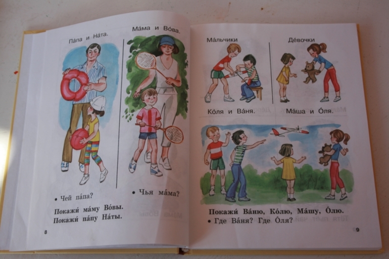Первая сверху "Чую, бачу, гавару"- на белорусском языке. Надя уже в школу пошла, пора потихоньку ее окунать в "родной иностранный". Построение книги напоминает иллюстрированный тематический словарь. Мне такая форма нравится: можно и слова новые узнать, и просто рассказать по картинке. Начала я с предисловия - и это моя стратегическая ошибка :) дочка тут же заскучала, хотя белорусский и русский пересекаются во многом. Когда перешли к разворотам с картинками, стало полегче.