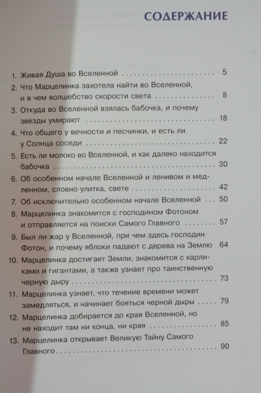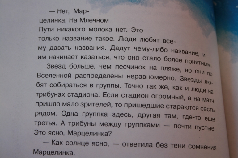 До чего ж хорошая книжечка! Добрая, с юмором и просто о сложных вещах. Девочка (точнее то, что скоро станет девочкой) путешествует по вселенной с Духом. Он рассказывает Марцелинке о теории относительности, о бесконечности, о рождении и смерти звезд, о теории большого взрыва и скорости света, о черных дырах...В общем, Дух дает познавательную часть. А Марцелинка рассказывает Духу о всяких мелочах жизни, которые происходят с людьми. И все это - в поисках Самого Главного!